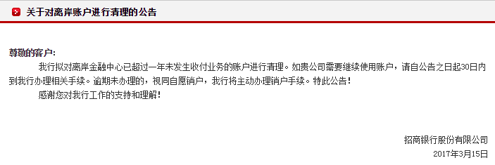 招商銀行曾在今年3月發(fā)布過《關(guān)于對(duì)離岸賬戶進(jìn)行清理的公告》: