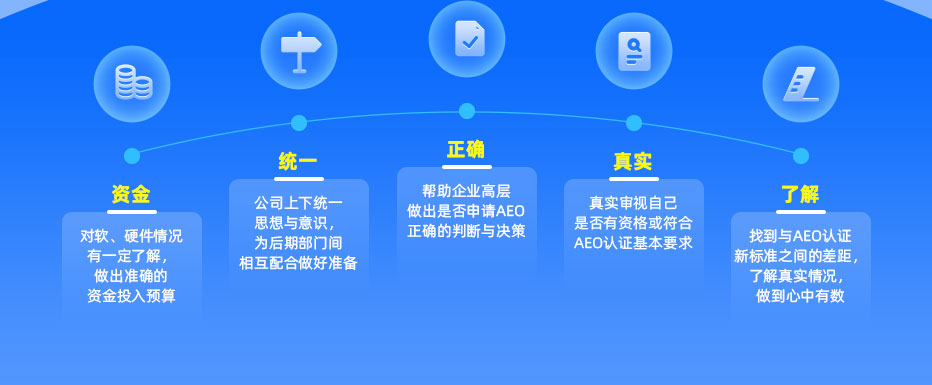在AEO認證工作啟動前,企業(yè)有必要對AEO認證標準的學習,及對企業(yè)自身真實情況的審視與了解。在人力、物力、資金,特別是思想意識上都沒準備好就盲目上線,等于是浪費時間和成本。一次AEO認證不成功,你要等整整一年才有申請資格,你相當于浪費自己兩年的時間。